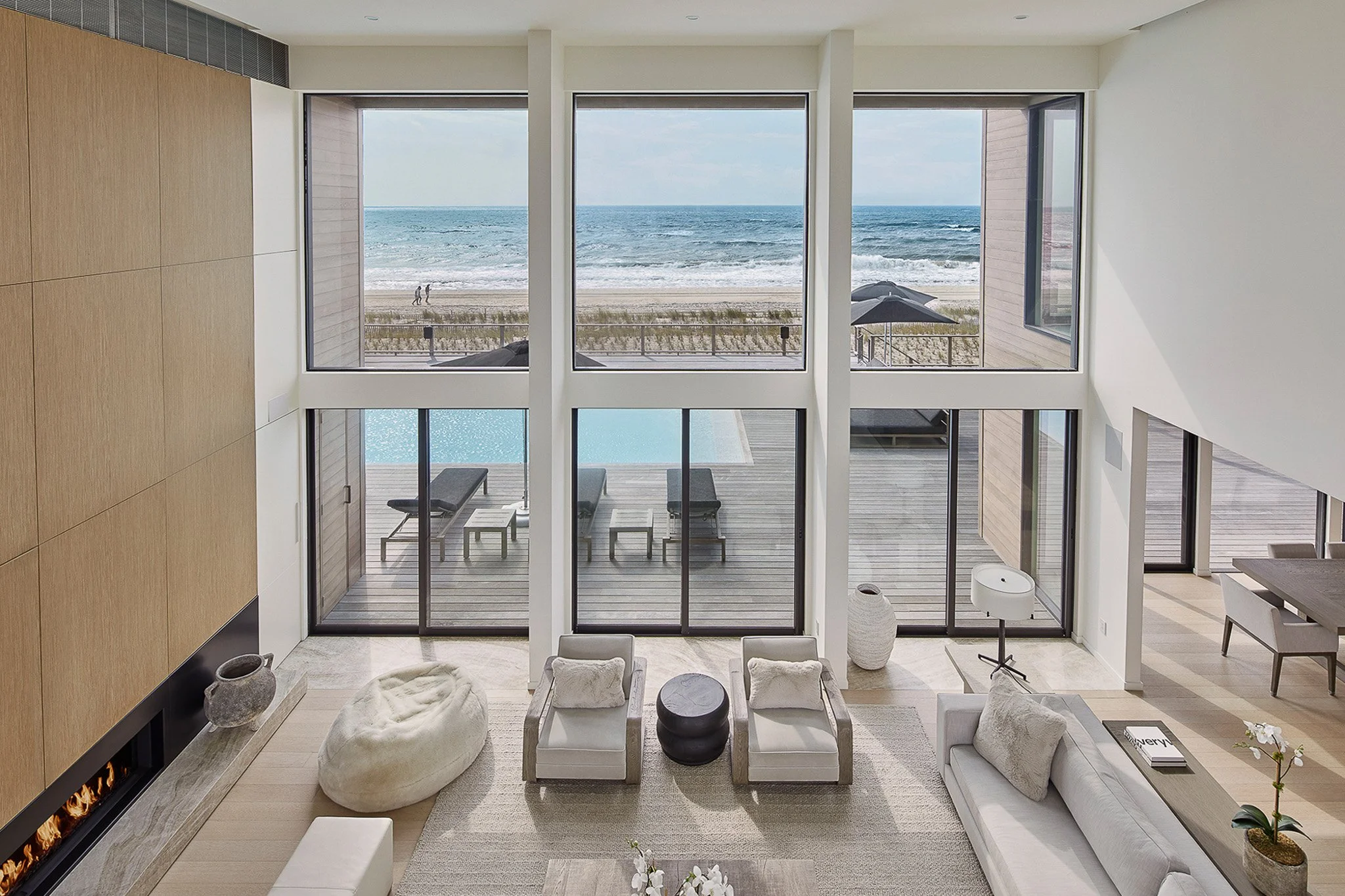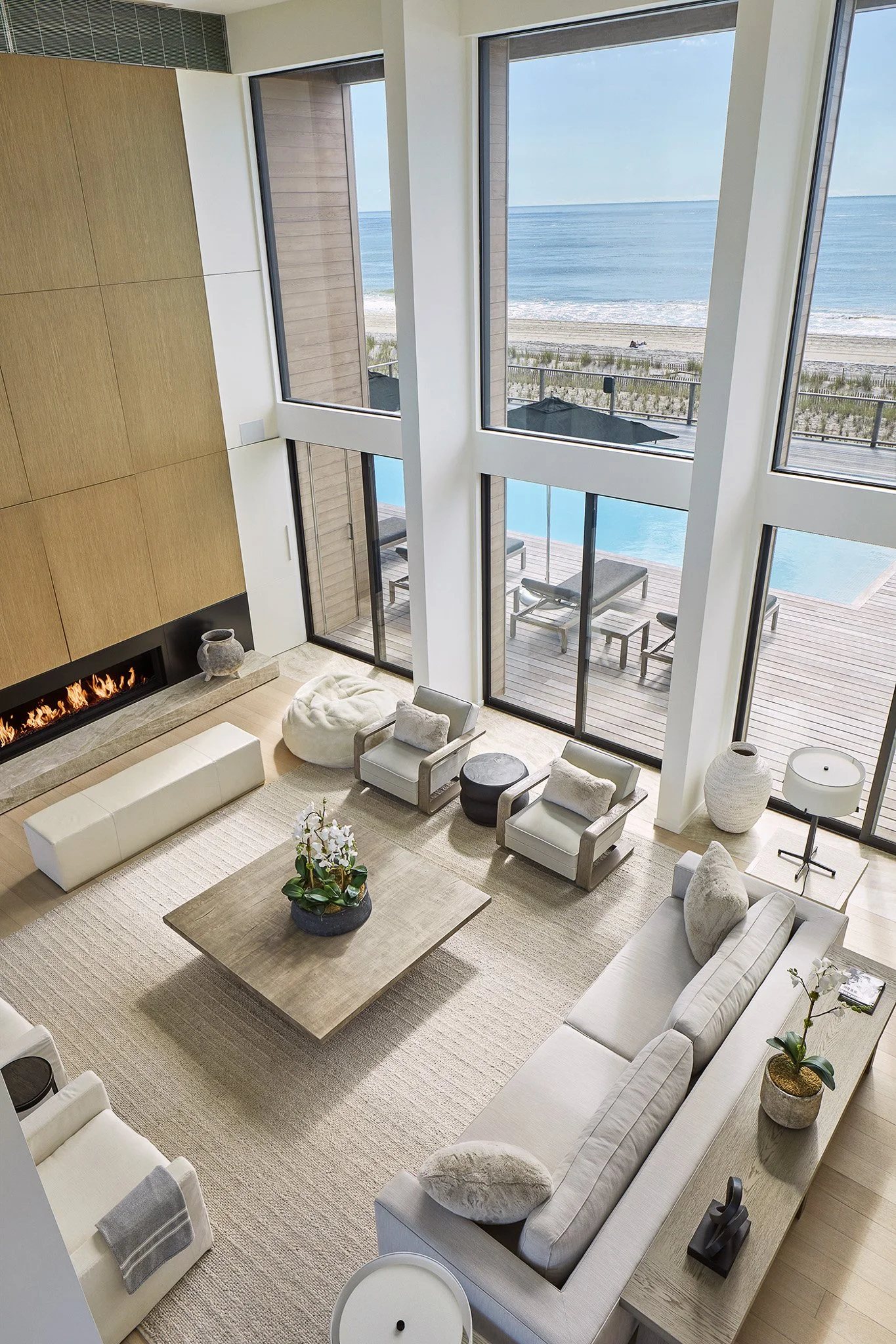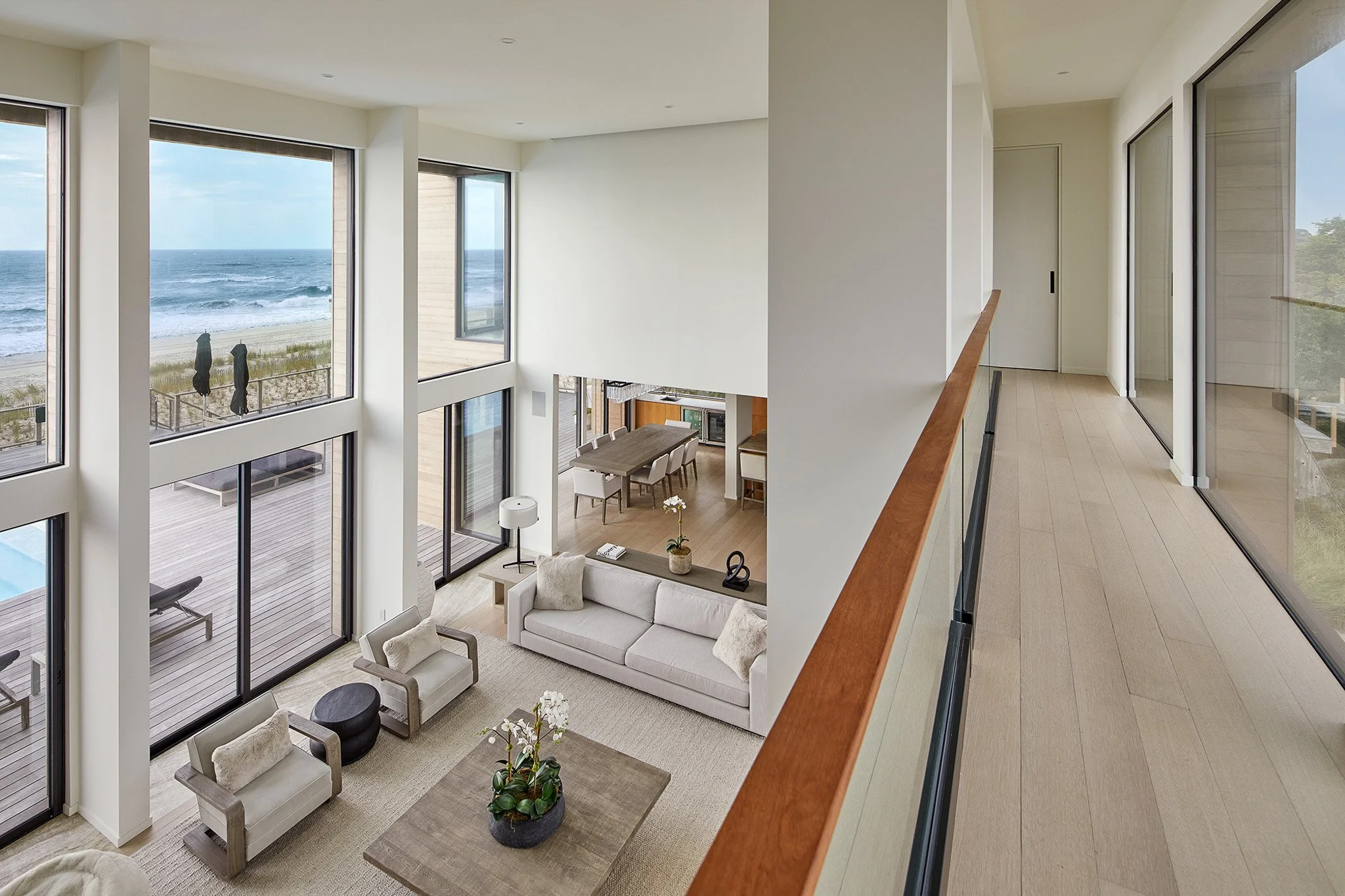 Complete renovation/restoration and enlargement to a large oceanfront house on Long Island. In addition to rebuilding the envelope, we raised the entire house to comply with current FEMA regulations. We also reclad the building, replaced all the windows and doors, built a new entry ramp with a shade trellis, rebuilt the decks and swimming pool, and provided a new rooftop terrace. Additionally, the entire interior was rethought, rebuilt, re-lit and refinished.
