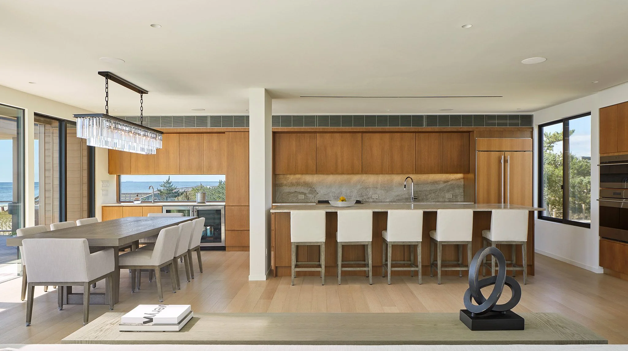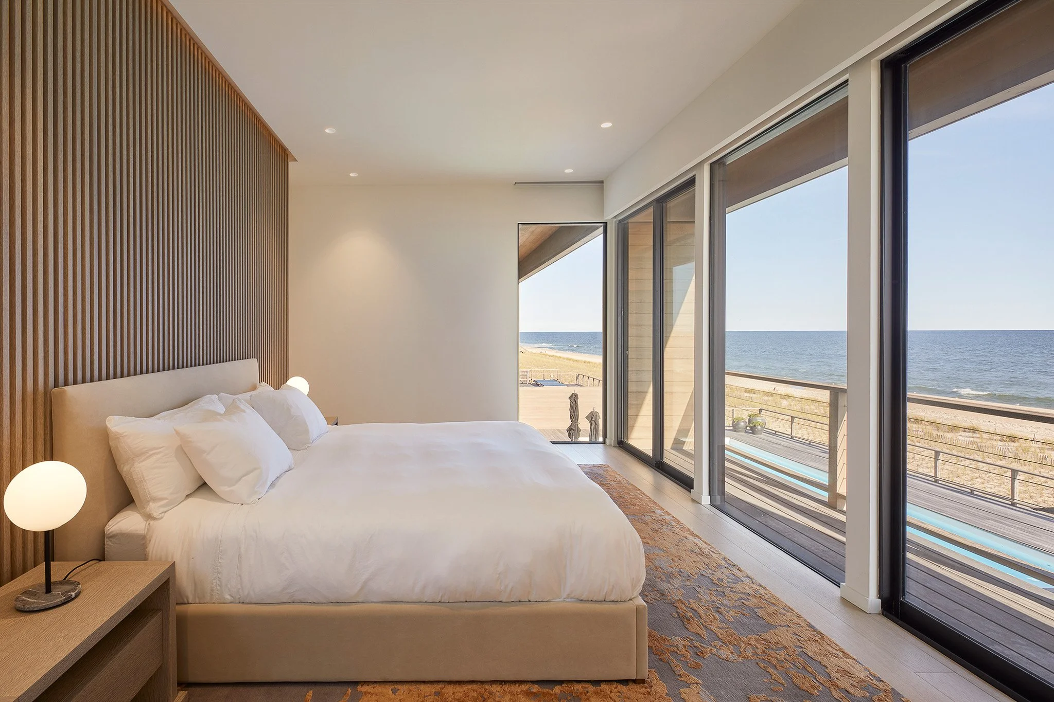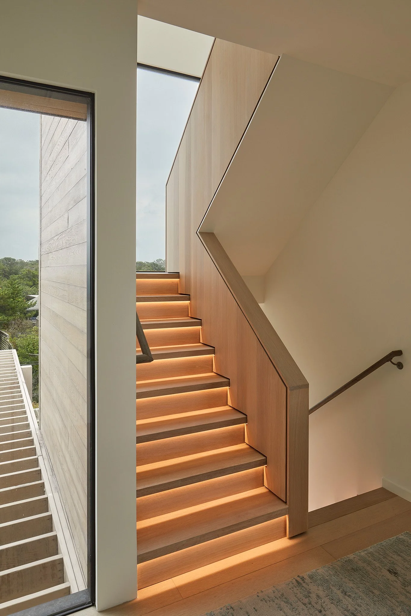 Complete renovation/restoration and enlargement to a large oceanfront house on Long Island. In addition to rebuilding the envelope, we raised the entire house to comply with current FEMA regulations. We also reclad the building, replaced all the windows and doors, built a new entry ramp with a shade trellis, rebuilt the decks and swimming pool, and provided a new rooftop terrace. Additionally, the entire interior was rethought, rebuilt, re-lit and refinished.