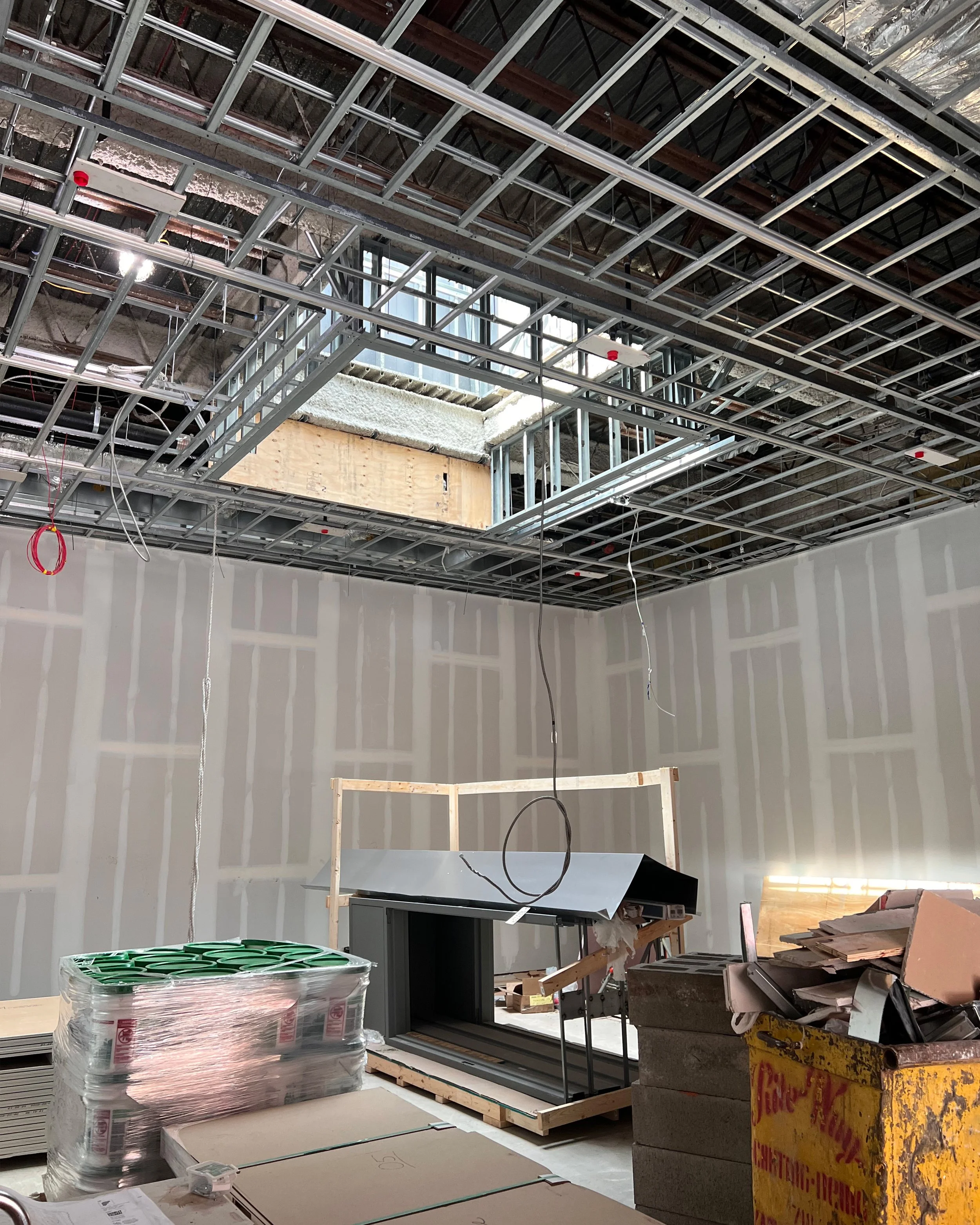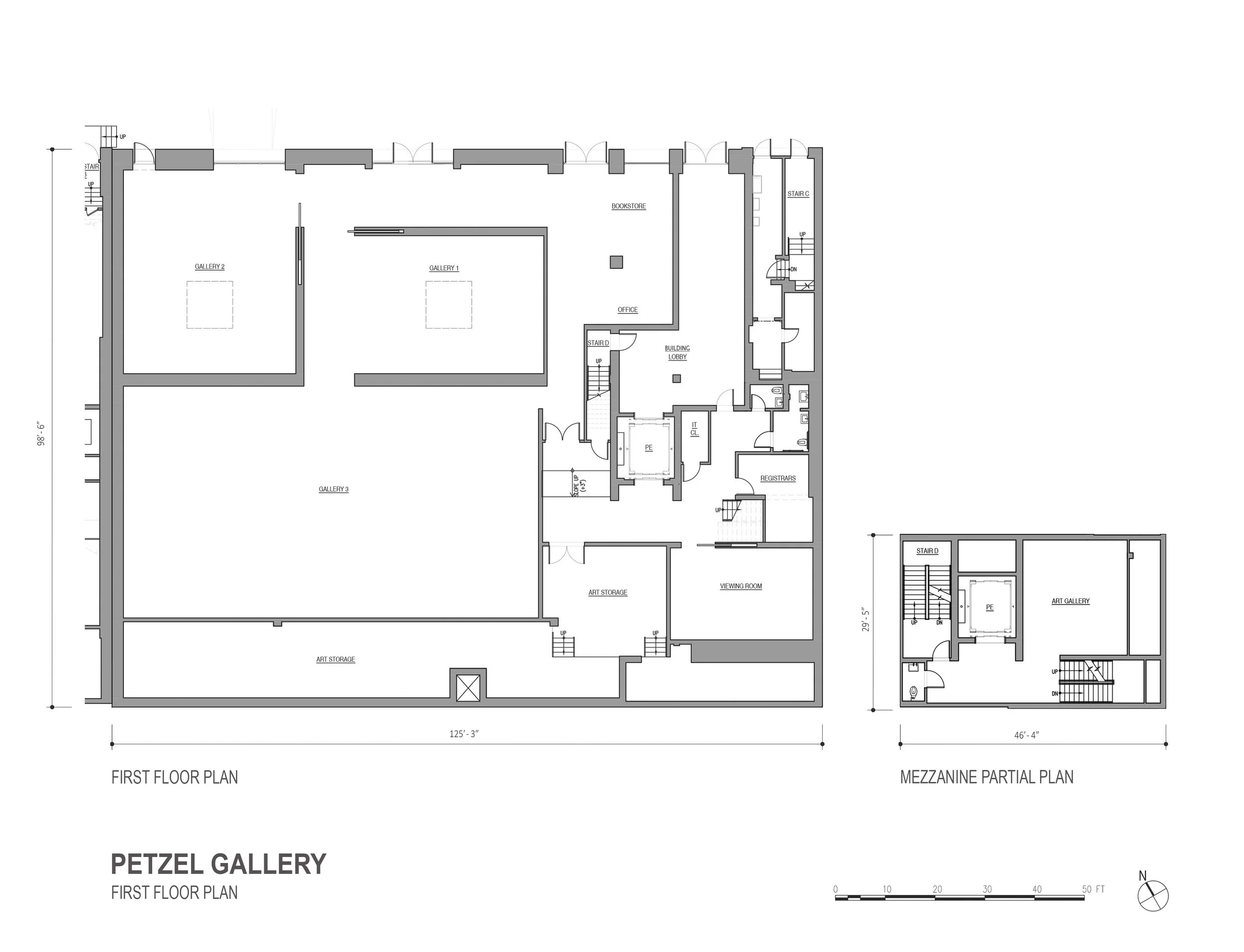Our proposal removed the second floor to create a minimalist, museum-quality gallery on the first floor with 20’ high ceilings. We inserted four new columns holding new girders running east/west supporting north/south beams which in turn support the existing third and fourth floors! (We recaptured some of the lost second floor space by enlarging the building with an expansion of the footprint at the third and fourth floors.) The floor is poured concrete with a smooth micro-topping finish. There are three large galleries – two are skylit – that can be separated by large sliding panels, a bookstore, reception desk and office on the ground floor as well as a small viewing room, art storage and registrars back-of-house. An additional private viewing room is on a new mezzanine above the back-of-house space in the southeast corner. Petzel’s offices are located in half of the third floor, wrapped around the new sculpture garden built on the landscaped roof of the one-story addition.